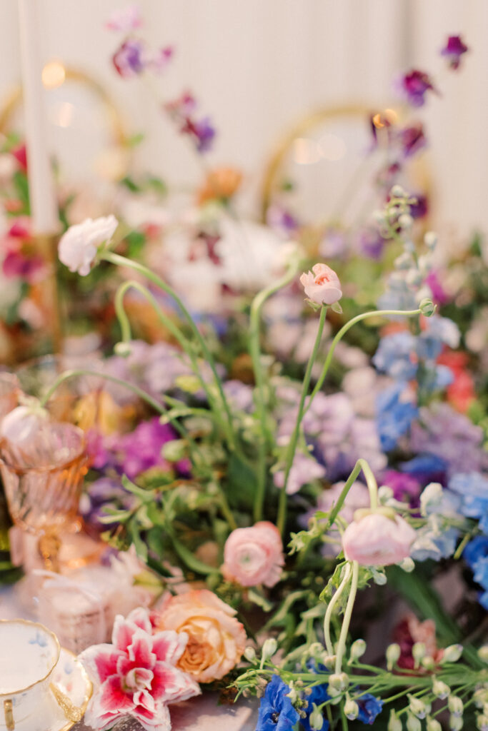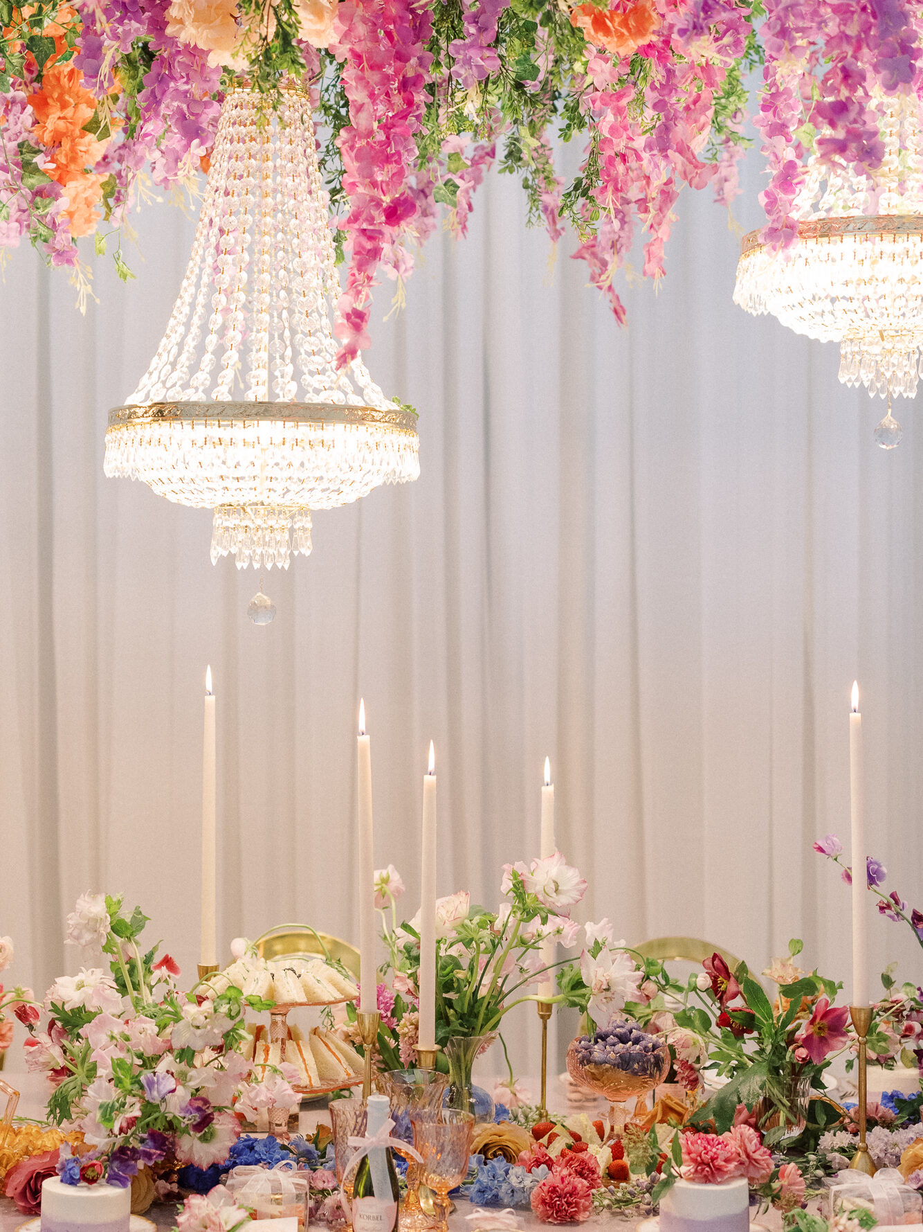 Our editorial captures the essence of Bridgerton, featuring a stunning tablescape adorned with colorful floral arrangements and elegant décor. The lush blooms and opulent chandeliers create an atmosphere that transports guests to the Regency era, while our table settings reflect timeless elegance with intricate designs. In my mind, I envisioned Bridgerton wedding inspiration with a pastel tablescape featuring lavender, peach, pink, and blue. Floral arrangements include peonies, garden roses, and anemones. Candles of varying heights illuminate the setting, while linens with intricate patterns and lace enhance the design