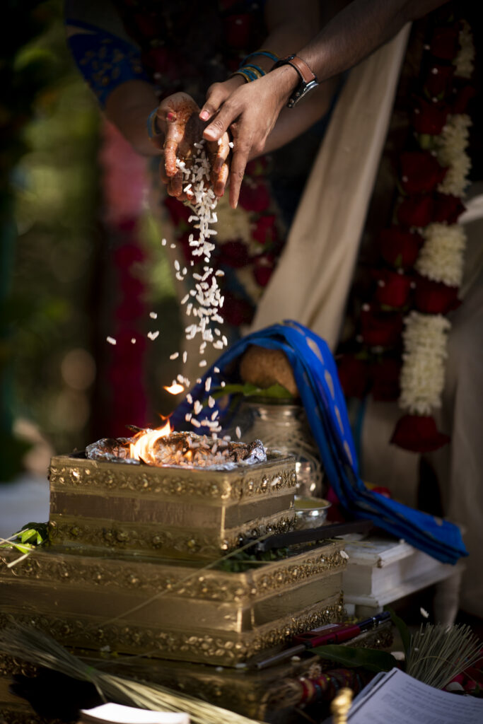 Maalai Maatral – One partner is brought into the wedding mandap and the couple exchange flower garlands as a first step of the wedding. The ritual is repeated three times. Sometimes the couple playfully tries to evade garlanding by the other, adding a lighthearted, affectionate moment within the sacred wedding setting.